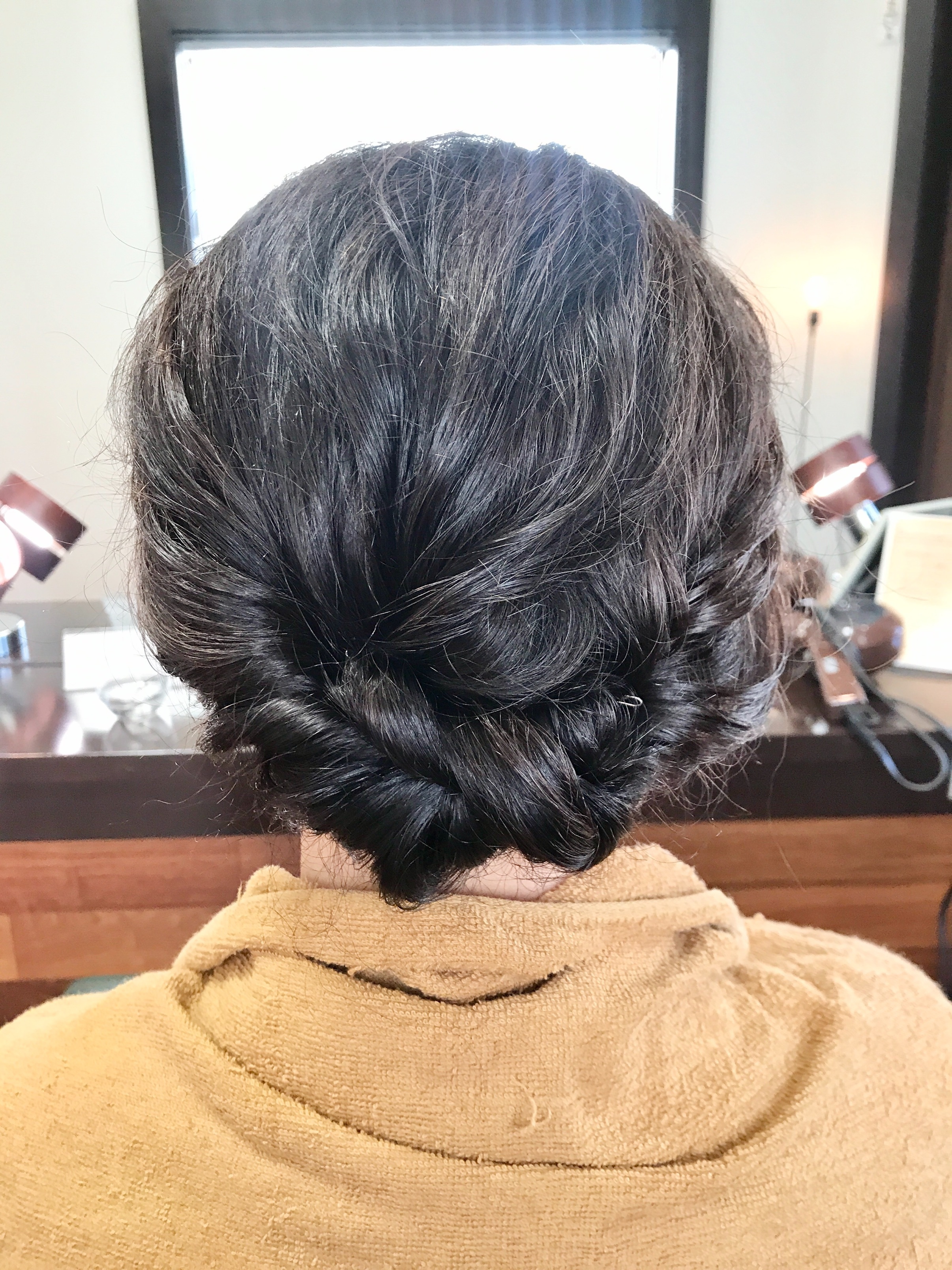 毛先を反対側のくるりんぱの中に入れてピンで留めます
